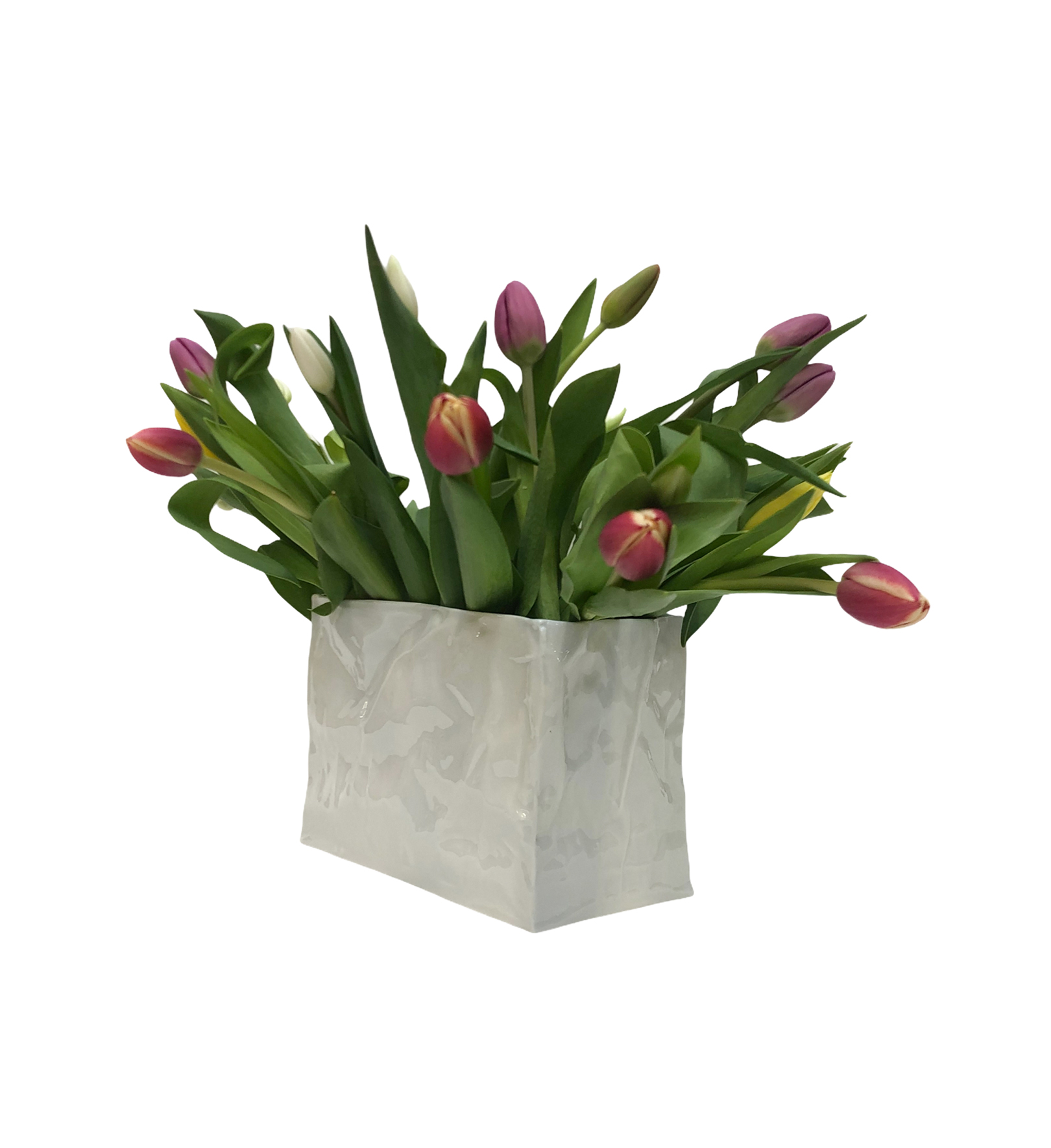 Deze vaas is van gevouwen papier gemaakt door Anne van den Berg. Van het gevouwen papier is een mal van gips gemaakt en in deze mal wordt de vaas gegoten.