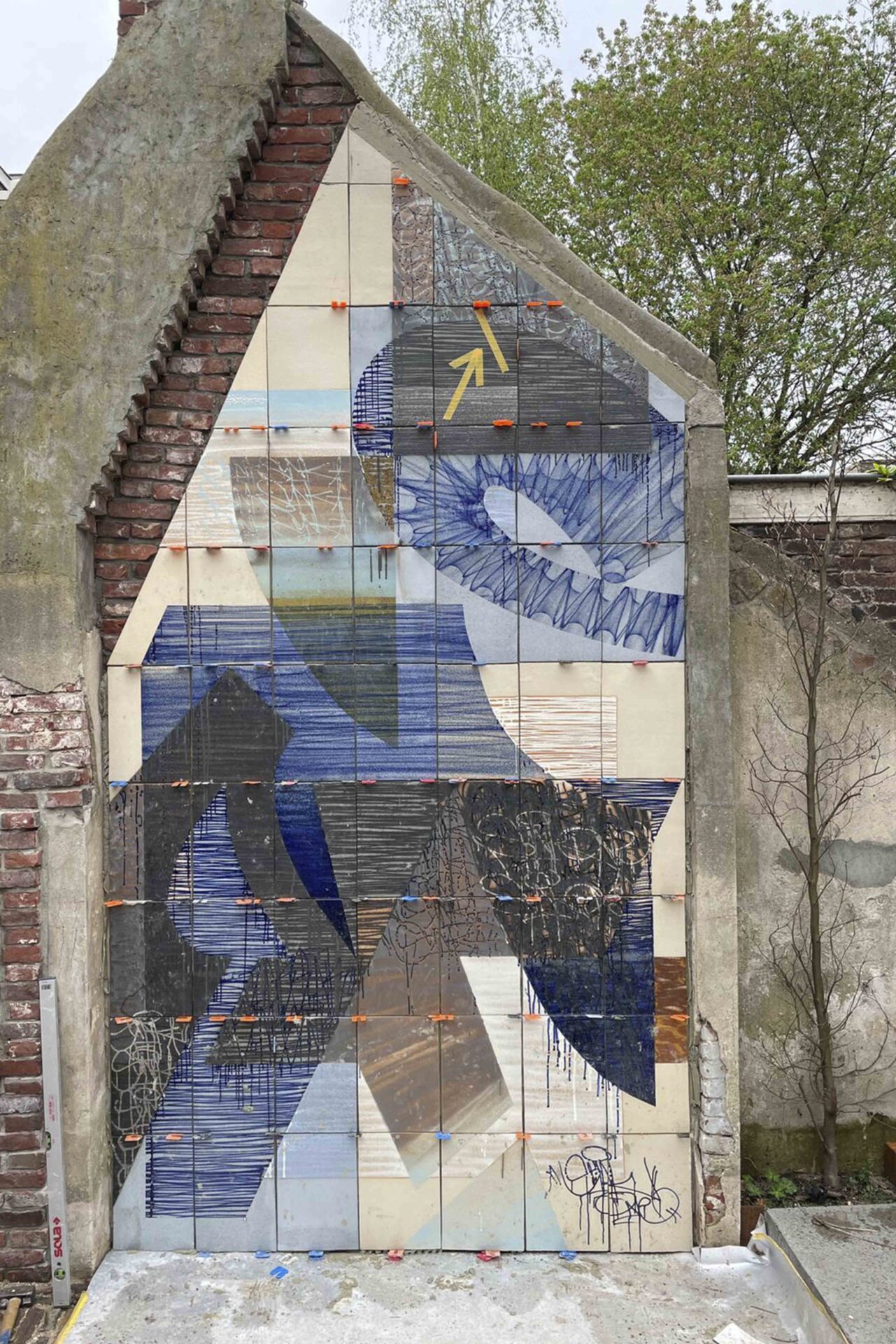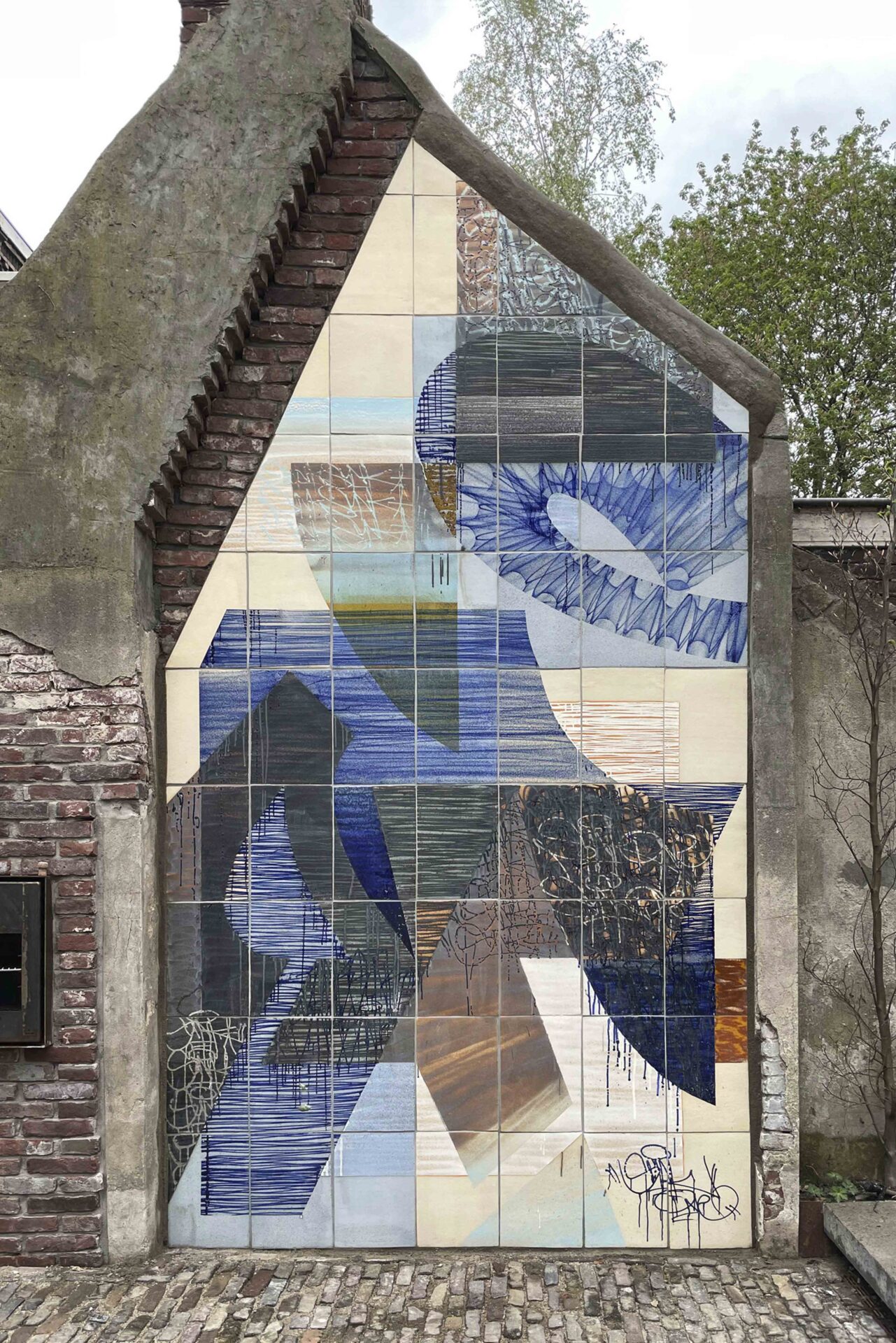 ‘S Werelds eerste graffiti muurschildering gespoten met keramisch glazuur. Graffitischrijver Yuri van Poppel en Cor Unum Ceramics slaan de handen ineen om een uniek keramisch kunstwerk te maken Een particuliere kunstverzamelaar gaf Yuri van Poppel de opdracht om een muurschildering te maken in de tuin van zijn historische herenhuis. In nauwe samenwerking met de keramiekspecialisten van Cor Unum werden steengoed tegels in 2 kleikleuren met de hand gemaakt als canvas voor een compositie op basis van fragmenten van zijn wildstyle graffiti stukken. Meerdere lagen tags en lijnen in verschillende kleuren werden vervolgens aangebracht in 2 sessies van glazuren en bakken in de oven. Door de herhaling en gelaagdheid van de tags ontstonden nieuwe patronen, wat resulteerde in een uniek en eeuwigdurend kunstwerk dat direct aanvoelt alsof het er altijd al heeft gestaan.